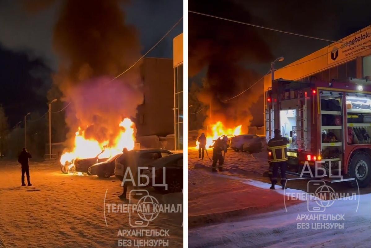 Ночью в Архангельске загорелись три машины — пожар сняли на видеоДва автомобиля полностью уничтожены огнем